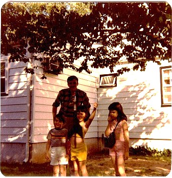 The Most Amazing Photo! Ray, Cathy, Caroline & Joe Chaneski at Aunt Joan & Uncle Mitchell's barbeque sometime in the 1970's. They are playing lawndarts and Caroline (hand up) has just thrown a dart. Can you see that the dart is captured in the middle of the picture in a frozen-like state? A cool keeper of a picture.. and a nice memory! |